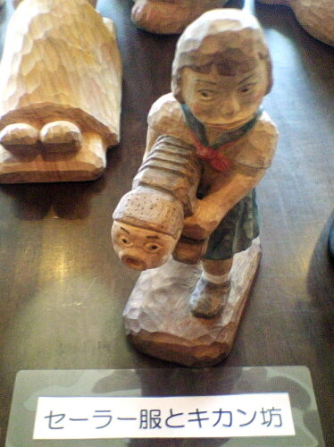 この楽しい彫刻の作者は、岩崎さんという、自称「笑刻家」で